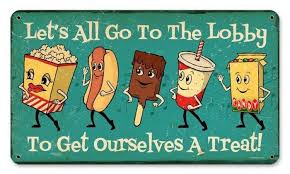 Speaking of scenes on film, that song, “Let’s all go to the lobby…” is lodged in my childhood brain from numerous trips to the drive-in on a summer’s night. I wouldn’t call the soda fountain type, confection-stocked area, that is really a small shack in a parking lot, a lobby. But there we go playing around with words and muddling their meaning! Really!